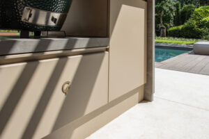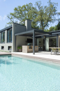 Warm, family filled moments. Kids in and out of the pool, someone cooking, others at the bar with a drink. Swimming, snacking, talking, watching something together. One setting, one long shared moment outside